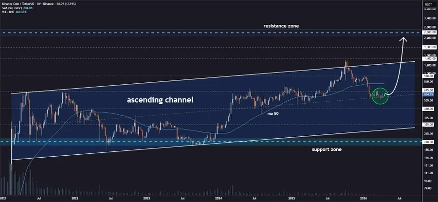 Crypto analyst Jonathan Carter highlighted that BNB remains above the middle line of an ascending channel on the weekly timeframe. It has acted as support in recent trading. He said that technical indicators are pointing to a potential rebound from this area.