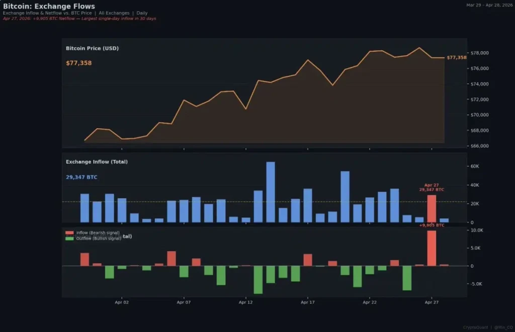 BTC experienced a net exchange inflow of 9905 BTC on April 27. The exchange received its highest single influx of digital currency for that month. Big numbers like that do not whisper. They speak clearly. The movement of coins to exchanges demonstrates a single purpose which exists to sell the coins.