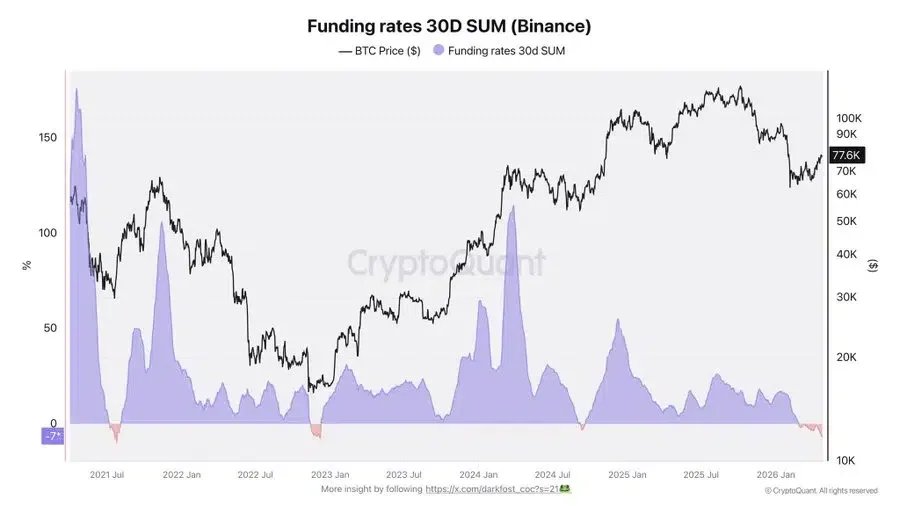 The rates of funding were negative over several weeks. The 30-day cumulative funding rate fell to almost -7. This is one of the worst readings ever.