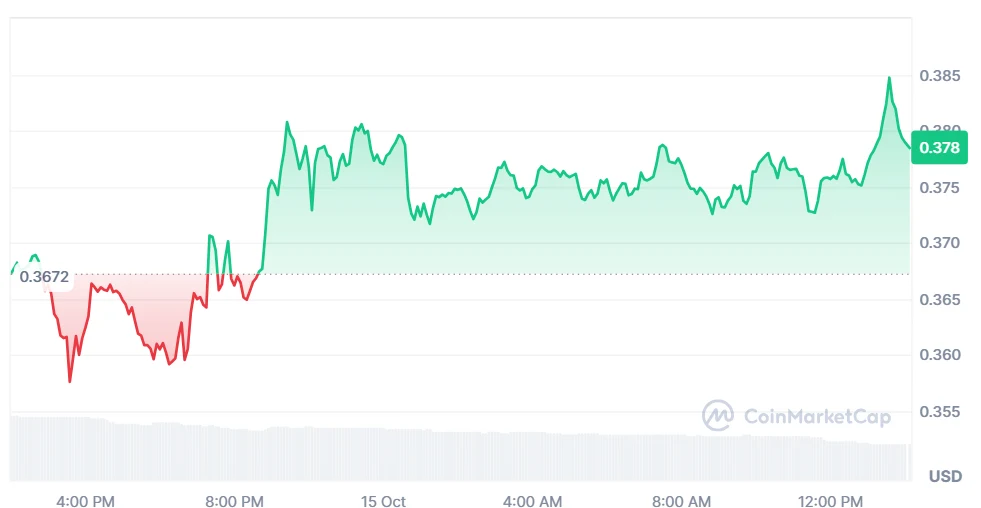Jupiter (JUP) has experienced a growth in price of 2.77% over the previous 24 hours, and it is currently trading at $0.3784. However, trading volume has reduced drastically by 42.01%, now being $41.09 million.