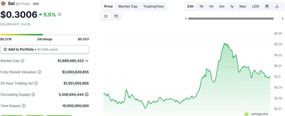 In just the last 24 hours, SEI climbed nearly 10%, while its weekly gain topped 90%. As of writing, the token trades at approximately $0.3021, marking a strong recovery from earlier corrections and setting a bullish tone for the network’s momentum heading into Q3.