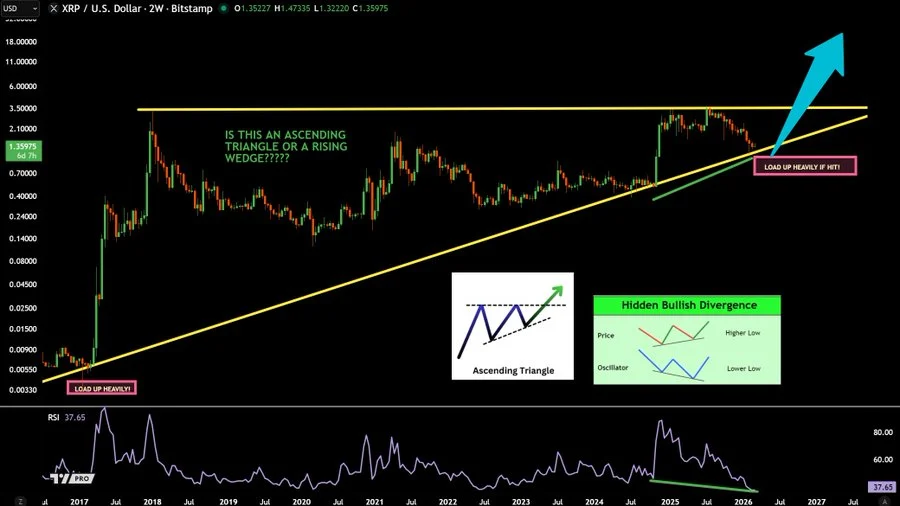 Analyst JD highlighted on March 9 that XRP continues to form a long-term bullish structure, tracing a rising trendline from early accumulation near sub-$0.01 levels.